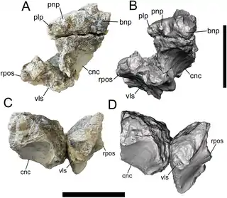 Los descriptores fueron capaces de identificar dos características distintivas. Estos son autopomorfismos, rasgos derivados únicos. Las dos ramas frontales del hueso de la frente, una hacia el punto de contacto entre el hueso frontal y nasal, la otra hasta el punto de contacto entre el hueso frontal y lagrimal, están juntas, separadas solo por una muesca poco profunda. Cuando la pata de la frente forma una costura de la pierna con el posorbital, la parte posterior tiene una proyección rectangular, curva hueca y dirigida lateralmente que está separada de la parte frontal de la frente por un surco profundo.[2]