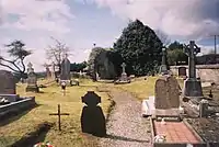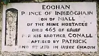 Eoghan fue enterrado, se cree, en la iglesia de St. Patrick en Iskaheen, Inishowen, Donegal. Una placa allí declara "Eoghan Príncipe de InisEóghain, Hijo de Niall de los Nueve Rehenes. Muerto 465 de dolor por su hermano Conall [Gulban]. Bautizado por Patrick y enterrado en Uisce Chaoin".