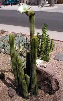 Cactus de porte columnar, se ramifica en numerosos tallos que surgen de la base. Alcanzan los 5 a 6 cm de diámetro y hasta 2 m de altura, de color verde lima. Posee de 10 a 15 costillas con areolas amarillentas que se vuelven grises con la edad, 1 a 3 espinas centrales de 12 mm de largo y 8 a 10 radiales del mismo tamaño de color dorado. Las flores, de hasta 20 cm de largo y 15 de diámetro son blancas, de hábito nocturno y surgen a finales de la primavera.