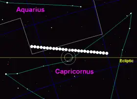 ![]() Representación del movimiento por hora de la Luna sobre el extremo norte de la penumbra de la Tierra en la constelación de Capricornio. | |||