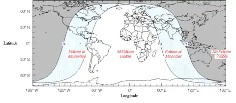 El siguiente mapa muestra las regiones desde las cuales fue visible el eclipse. En gris, las zonas que no presenciaron el eclipse; en blanco, las que si lo hicieron; y en celeste, las regiones que observaron el eclipse durante la salida o puesta de la luna.