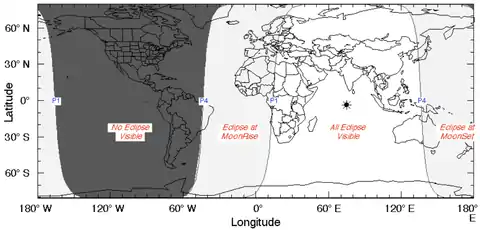El siguiente mapa muestra las regiones desde las cuales son posibles ver el eclipse. En gris, las zonas que no observarán el eclipse; en blanco, las que si son visibles; y en celeste, las regiones que pueden ser vistos el eclipse durante en la salida o la puesta de la luna.