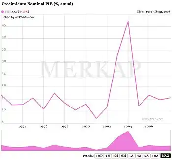 | Crecimiento económico | 4,5 % Fuente: Banco Mundial (2011) | Economías de mayor crecimiento[49] Puesto 76.º | 8,13 % en 2000 (incr: -44,6%) Fuente: Ficha de República Dominicana en Banco Mundial[35] |