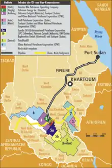 En los últimos años, una cantidad significativa de perforaciones petroleras en el extranjero ha comenzado en Sudán del Sur, elevando el perfil geopolítico de la tierra. Se pueden encontrar petróleo y otros recursos minerales en todo el sur de Sudán, pero el área alrededor de Bentiu se conoce comúnmente como especialmente rica en petróleo, mientras que Jonglei, Warrap y Lagos tienen reservas potenciales. Durante los años de autonomía de 2005 a 2011, Jartum dividió gran parte de Sudán en bloques, con aproximadamente el 85% del petróleo proveniente del sur. Los bloques 1, 2 y 4 están controlados por el consorcio más grande en el extranjero, Greater Nile Petroleum Operating Company (GNPOC). GNPOC se compone de los siguientes jugadores: Corporación Nacional de Petróleo de China (CNPC, República Popular de China), con una participación del 40%; Petronas (Malasia), con 30%; Corporación de Petróleo y Gas Natural (India), con 25%; y Sudapet del gobierno central de Sudán con 5%.