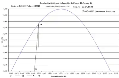 Para resolver la ecuación de Kepler, en el gráfico se dibuja una sinusoide. Sobre el eje x se mide M = OP y se dibuja una recta con inclinación sobre el eje x tal que: