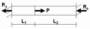 En este caso P es una fuerza conocida. Para poder determinar las reacciones observamos que la parte izquierda (entre RA y P) está traccionada y por tanto se estirará, mientras que la parte derecha (entre P y RB) está comprimida y por tanto se encogerá. Puesto que la pieza es un único sólido deformable el estiramiento de parte izquierda compensará exactamente el acortamiento de la parte derecha, de lo contrario la pieza se rompería. Por tanto estiramiento y acortamiento deben ser compatibles, esa es precisamente la condición de compatibilidad adicional que resuelve el problema: