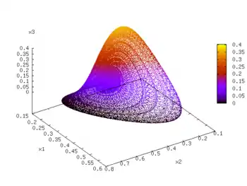 con para todos . Este sistema es caótico y tiene un mayor exponente de Lyapunov de 0.0203. Según los teoremas de Hirsch, es uno de los sistemas competitivos caóticos de Lotka-Volterra de menor dimensión. La dimensión de Kaplan-Yorke, una medida de la dimensionalidad del atractor, es 2.074. Este valor no es un número entero, indicativo de la estructura fractal inherente a un atractor extraño. El punto de equilibrio coexistente, el punto en el que todas las derivadas son iguales a cero, pero ese no es el origen, se puede encontrar invirtiendo la matriz de interacción y multiplicando por el vector de columna unitaria, y es igual a