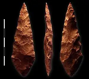 Otras innovaciones tecnológicas del período incluyen armas de proyectiles especializadas que se encuentran en varios sitios en África de la Edad de Piedra Media, tales como: puntas de flecha de hueso y piedra en sitios sudafricanos como Sibudu Cave (junto con una aguja de hueso temprana también encontrada en Sibudu) que data de aproximadamente 60,000- Hace 70,000 años,[20][36][37][38][39] y arpones de hueso en el sitio de Katanda en África Central que datan de hace aproximadamente 90,000 años.[40] También existe evidencia de que el tratamiento térmico sistemático de la piedra de silicato para aumentar su capacidad de formación de escamas con el propósito de fabricar herramientas, comenzó hace aproximadamente 164,000 años en el sitio sudafricano de Pinnacle Point y se hizo común allí para la creación de herramientas microlíticas hace aproximadamente 72,000 años.[41][42]