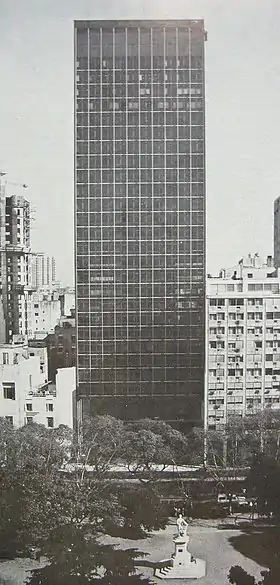 En 1974, el comitente Sinbra S.A. hizo cargo a la desarrolladora y constructora CHACOFI S.A. de un proyecto para levantar una torre de oficinas frente a la Plaza Roma, superando los 100 metros de altura y en un terreno relativamente angosto, entre medianeras. Allí se encontraba, desde la década de 1880, la antigua y lujosa residencia que el arquitecto Tamburini había hecho para el Presidente Miguel Juárez Celman.