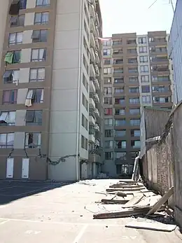 ![]() Edificio Plaza del Río con sus daños luego del terremoto del 27f. | ||