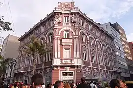 El edificio es de planta cuadrada ubicado en la esquina de una manzana, posee un acceso lateral a un patio central cubierto, rodeado por un corredor con columnas, por él se accede a oficinas que dan a la calle y otras laterales, escaleras y al cuarto nivel. Constructivamente la fachada y muros interiores son en mampostería, estructura en concreto armado, el entrepiso en placa y madera, cubierta en placa de concreto (terraza) y fibrocemento, marquesina en estructura metálica. Posee algunos frescos (pinturas) en el interior descubiertos y semidestruidos, obra de Colombo Ramelli, quien igualmente remató el ochavado con un frontón circular interrumpido, con las dos esculturas en mármol de Carrara que representan a Minerva y Mercurio.