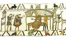 Haroldo entrevistándose con Eduardo, representados en la escena 25 del Tapiz de Bayeux