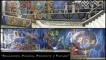 La obra se distribuye en dos partes: una al exterior de las dependencias, que utiliza una técnica de mosaico, y otra al interior del edificio, que utiliza la técnica del acrílico. Su temática es la evolución de la educación en Chile a lo largo de los años.[3]