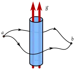 donde A es el potencial vector asociado a dicho campo. Aunque este sea cero en la zona por la que la partícula puede moverse, esto no implica que A sea cero también, lo que puede afectar al movimiento de la misma.