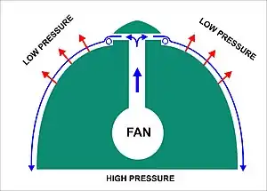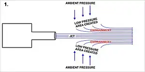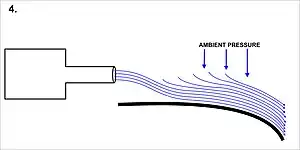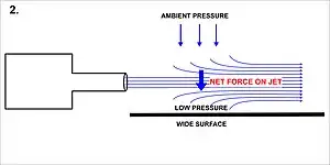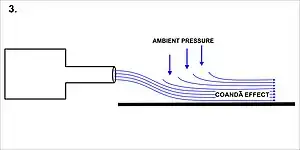 Un chorro de aire arrastra moléculas de su alrededor, creando un "tubo" o "manguito" de baja presión alrededor del chorro (ver Diagrama 1). Las fuerzas resultantes de este tubo de baja presión compensan cualquier flujo inestable perpendicular, lo que estabiliza el chorro en una línea recta. Sin embargo, si se coloca una superficie sólida cerca paralela al chorro (ver Diagrama 2), el arrastre de aire entre la superficie sólida y el chorro provoca una reducción en la presión en ese lado, desviando el chorro en el proceso (ver Diagrama 3).[3][4] Con superficies curvas, el chorro se desvía más (ver Diagrama 4), porque cada cambio infinitesimal en la dirección de la superficie produce los efectos descritos para la flexión inicial del chorro hacia la superficie, incrementando la adherencia del chorro.[4][5]