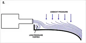 Si la superficie no es perfectamente curva, el chorro, bajo las circunstancias adecuadas, puede adherirse a la superficie incluso tras rotar 180° y así ir en la dirección opuesta a la inicial. Las fuerzas que causan estos cambios en la dirección generan una fuerza igual y opuesta en la superficie por la que fluye el chorro.[4] Estas fuerzas inducidas por el efecto Coandă se pueden aprovechar para generar sustentación u otros tipos de movimiento, dependiendo de la orientación del chorro y de la superficie a la que se adhiere.[3] Si ponemos un pequeño "labio" donde comienza el chorro (ver Diagrama 5), se produce un vórtice de baja presión detrás del labio, aumentando la desviación del chorro hacia la superficie.[3]