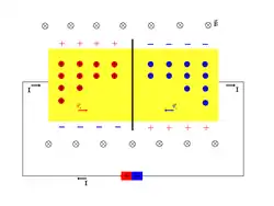 En la figura de al lado se ve cómo el material tiene dos zonas: la de la izquierda y la de la derecha. En una zona, los portadores son huecos y en la otra electrones.