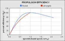 Los motores cohete tienen una eficiencia propulsora () ligeramente diferente a la de los motores a reacción que respiran aire, ya que la falta de aire de admisión cambia la forma de la ecuación. Esto también permite a los cohetes superar la velocidad de su escape.
