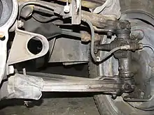 El eje de pivote coincide con un componente físico identificable -el perno del pivote de dirección- en los sistemas de dirección más antiguos, mientras que en los más modernos es un concepto geométrico utilizado para calcular el lanzamiento. El término también se utiliza para referirse al pivote central o quinta rueda en el eje anterior de algunos carruajes.[3]