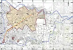 ![]() Recorrido (en naranja) del eje monumental en el plano de la ciudad del Cusco. | ||