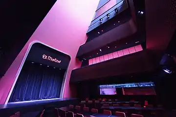 El interior conecta las dos fachadas mediante una lengua roja, en algunas partes ondulada, por la cual los espectadores se desplazan como si estuvieran dentro de una boca. Está hecha de pladur perforado, un material económico que evita reverberaciones, permite una buena audición y tiene buena electroacústica.