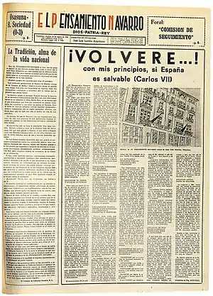 El periódico recordaba asimismo que su motivo de vida había sido el lema «Dios, Patria, Rey, que pudiera completarse con un cuarto sustantivo, Fueros» e indicaba que «la defensa del ser de Navarra —en sus españolísimos fueros— ha sido una constante de esta publicación».[39] Con la intención de continuar la senda doctrinal marcada por El Pensamiento Navarro en el ámbito religioso, nació en 1982 el semanario católico navarro Siempre P'alante,[40] que se publicó hasta 2021 y defendía la unidad católica de España.[41]