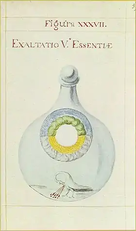 ![]() Figura XXXVII. Exaltatio V. Essentiae. Sapientia veterum philosophorum sive doctrina eorumdem de summa et universali medicina, siglo XVIII, Biblioteca del Arsenal, París. Imagen en guardas de la edición castellana de Ediciones Atalanta. | ||