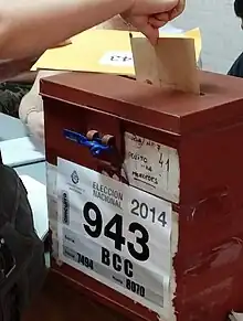 En cuanto al sistema de votación, desde principios del siglo XX Uruguay aplica la antigua tecnología de depositar el sobre que contiene la hoja de votación dentro de una urna.[5] Al finalizar la jornada comicial, los integrantes de la mesa receptora de votos proceden a realizar el escrutinio, es decir, a contar los votos, en presencia de delegados partidarios.