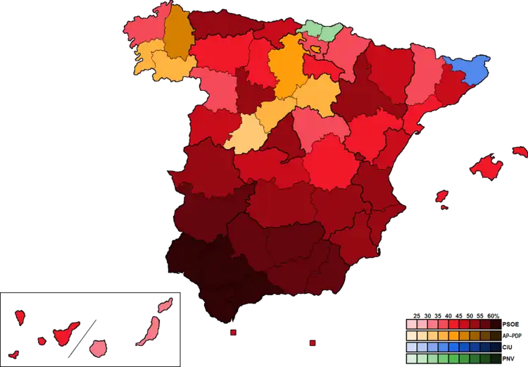Aunque los resultados fueron previsibles, la contundencia de la victoria del PSOE de Felipe González resultó ser más abultada de lo esperada. Bajo el lema Por el cambio, el PSOE cosechó un resonante triunfo al obtener más de diez millones de votos, lo que suponía cerca del 50 % de los votantes, y la mayoría absoluta en el Congreso de Diputados (202 diputados) y en el Senado (134 senadores).[28][29] Esto se tradujo en que el PSOE obtuviera la mayoría de votos en cuarenta de las cincuenta provincias españolas, así como en muchas capitales de provincia y grandes centros urbanos. Los 10.127.392 de votos (48,4% del censo) que obtuvieron los socialistas consituían toda una novedad.[30] Para el PSOE ésta era la primera vez en su historia que el partido ganaba unas elecciones generales con mayoría absoluta. Y de hecho, suponía la primera vez desde la Guerra civil que el PSOE regresaba al poder, liderando el gobierno de la nación.