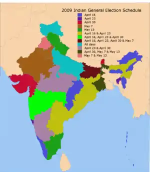 Las elecciones generales en India de 2009 renovaron los 543 escaños del 15.º Lok Sabha. Se realizaron en cinco fases: el 16 de abril, el 22 y 23 de abril, el 30 de abril, el 7 de mayo y el 13 de mayo de 2009. Los resultados de la elección fueron anunciados el 16 de mayo de 2009.[1]