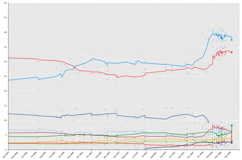 Los principales competidores en las elecciones fueron Silvio Berlusconi, como líder de la coalición de oposición de centroderecha, y Walter Veltroni, líder del Partido Democrático. La coalición de derecha de Berlusconi lideraba por un margen significativo en las encuestas de opinión.[18] Berlusconi, de 71 años, quien fue dos veces primer ministro —de mayo de 1994 a enero de 1995 y nuevamente de mayo de 2001 a mayo de 2006— no era considerado demasiado viejo para el trabajo, aunque se había sometido a una cirugía cardíaca desde que dejó el cargo.[19]