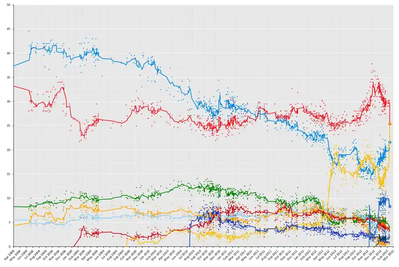 La alianza de centroizquierda Italia. Bien Común dirigida por el Partido Democrático obtuvo una clara mayoría de escaños en la Cámara de Diputados, gracias a un bono de la mayoría que efectivamente ha triplicado el número de escaños asignados a la fuerza ganadora, mientras que en el voto popular por poco derrotó a la alianza de centroderecha del ex primer ministro Silvio Berlusconi. Muy cerca, el nuevo antiestablishment Movimiento 5 Estrellas del comediante Beppe Grillo se convirtió en la tercera fuerza, claramente por delante de la coalición centrista del primer ministro saliente, Mario Monti. En el Senado, ningún grupo político o partido ganó una mayoría absoluta, lo que resultó en un parlamento colgado.[3][4] Finalmente, se formó una gran coalición entre Italia. Bien Común, la coalición Berlusconi y el centro.[5] Berlusconi y sus aliados retiraron el apoyo a la coalición y formaron la nueva Forza Italia seis meses después, lo que hizo que el PD de centroizquierda dominara la coalición del gobierno hasta las elecciones de 2018.
