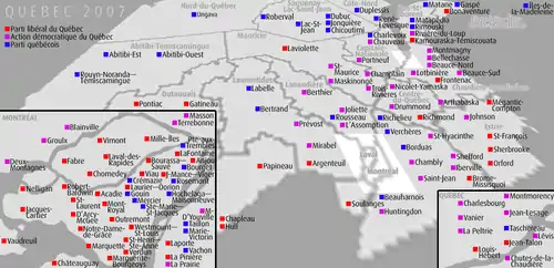 | Elecciones generales de Quebec de 2007 125 escaños en la Asamblea Nacional 63 escaños necesarios para obtener mayoría absoluta | |||||||||||