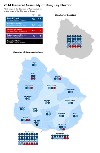 | Elecciones generales de 2014 Presidente y Vicepresidente de la República 30 miembros de la Cámara de Senadores 16 escaños necesarios para la mayoría absoluta 99 miembros de la Cámara de Representantes 50 escaños necesarios para la mayoría absoluta | |||||||||||