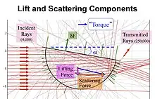 En la elevación óptica, creada por un "hoja de luz", la elevación se crea dentro del objeto transparente mientras que la luz brilla a través de él y es refractada por sus superficies internas. En las barras de luz, una mayor proporción de hojas de luz en una dirección perpendicular a la viga y, por lo tanto, este lado experimenta una mayor presión de radiación y, por tanto, levante.[2]