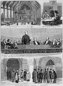 Wolstenholme fundó el Comité de Manchester para el derecho al voto de la mujer en 1865 y comenzó 50 años de vigorosa campaña a favor del sufragio femenino : el derecho al voto. Abandonó su escuela en 1871 y se convirtió en la primera empleada remunerada del movimiento de mujeres cuando fue contratada para hacer lobby y reclamar al Parlamento la modificación de leyes perjudiciales para las mujeres. [7] Apodada ' el azote de los comunes ' o el ' perro guardián del gobierno ', Wolstenholme se tomó su papel muy en serio. Cuando los grupos locales de mujeres sufragistas flaquearon tras la decepción de los proyectos de ley de sufragio fallidos, Wolstenholme fue fundamental para mantener el impulso del comité de su ciudad con una reagrupación en 1867 bajo el nombre de Sociedad de Manchester para el Sufragio de Mujeres .