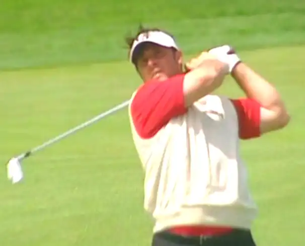 ![]() Emanuele Canonica dándole a la bola en uno de sus seis intentos ante la mirada de los otros tres competidores: Sergio García, Johan Edfors y Paul Slater | |||