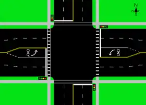 Como se describe en Kainen (1990), se puede usar un libro embebido para describir las fases de un semáforo en una intersección controlada. En una intersección, los carriles de tráfico de entrada y salida (incluidos los extremos de los cruces peatonales y los carriles para bicicletas, así como los carriles para vehículos motorizados) pueden representarse como los vértices de un grafo, colocados en el lomo de un embebido en libro dispuesto en sentido horario según su orden alrededor del cruce. Los caminos a través de la intersección tomados por el tráfico para pasar de un carril de entrada a un carril de salida pueden representarse como los vínculos de un grafo no dirigido. Por ejemplo, este grafo podría tener un vínculo desde un carril de tráfico de entrada a uno de salida que pertenecen al mismo segmento de la carretera, lo que representa un giro en U desde ese segmento de regreso a ese segmento, solo si los giros en U están permitidos en el cruce de carreteras. Para un subconjunto dado de estos vínculos, el subconjunto representa una colección de caminos que se pueden recorrer sin interferencias entre sí, si y solo si el subconjunto no incluye ningún par de vínculos que se cruzasen si los dos vínculos se colocaran en una sola página de un libro de embebido. Por lo tanto, el embebido en libro de este grafo describe una partición de las rutas en subconjuntos que no se interfieren entre sí, y el grosor del libro de este grafo (con su embebido fijado en el lomo) proporciona el número mínimo de fases distintas necesarias para un programa de señalización que incluye todas las rutas de tráfico posibles a través del cruce.[51]
