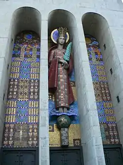 Mosaico de la Virgen María, fachada de la Frauenfriedenskirche), obra del arquitecto Hans Herkommer en Bockenheim.