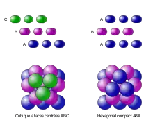 Las dos disposiciones más comunes son llamadas empaquetamiento cúbico centrado en caras – alternancia ABCABC...- y empaquetamiento hexagonal – alternancia ABAB...-. Pero todas las combinaciones son posibles (ABAC, ABCBA, ABCBAC, etc.) En todas estas disposiciones cada esfera está rodeada por otras 12, y ambas disposiciones tienen una densidad media de