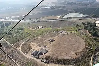 ![]() Foto aérea de Tel Esur en primer plano con En Esur a la izquierda, Autopista 65 en el centro, y Barkai en el fondo | ||