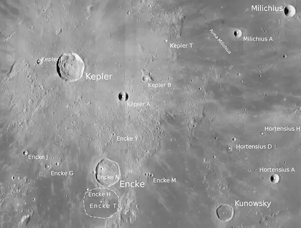Encke es un cráter de impacto lunar que se encuentra en el borde occidental del Mare Insularum, al sur-sureste del cráter Kepler. El pequeño cráter Kunowsky se halla al este-sureste del mar lunar.