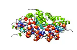 Homodímero de I-CreI sobre el DNA: la enzima se muestra en todo su volumen, cada monómero de un color, rosa o amarillo. Los átomos del DNA se muestran en esferas, coloreadas según cada elemento químico.