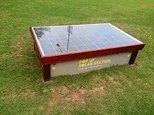En la década de 1980 y principios de la década de 1990, la mayoría de los módulos fotovoltaicos proporcionaban suministro de energía de área remota , pero desde aproximadamente 1995, los esfuerzos de la industria se han centrado cada vez más en desarrollar edificios fotovoltaicos integrados y centrales eléctricas para aplicaciones conectadas a la red (consulte el artículo sobre centrales fotovoltaicas para más detalles). Actualmente, la planta de energía fotovoltaica más grande de América del Norte es la planta de energía solar de Nellis (15 MW).[41][42] Existe una propuesta para construir una central de energía solar en Victoria, Australia, que sería la central fotovoltaica más grande del mundo, con 154 MW.[43][44] Otras grandes centrales fotovoltaicas incluyen la planta de energía solar Girassol (62 MW),[45] y el Parque Solar Waldpolenz (40 MW).[46]