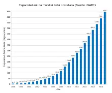 Algunas de las energías renovables de segunda generación, como la energía eólica, tienen un alto potencial y ya han tenido costos de producción relativamente bajos. A fines de 2008, la capacidad de los parques eólicos en todo el mundo era de 120,791 megavatios (MW), lo que representó un incremento del 28.8 por ciento durante el año,[30] y la energía eólica produjo aproximadamente el 1.3% del consumo mundial de electricidad.[31]