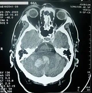 ![]() TAC de cráneo mostrando hemorragia intracerebral profunda por sangrado en el cerebelo (zona grisácea), aproximadamente 30 horas desde su inicio. | ||