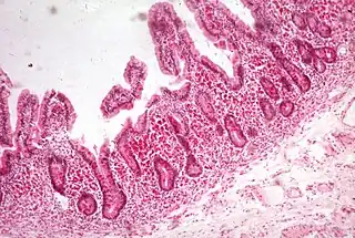 Enfermedad de Whipple: agrandamiento de las vellosidades intestinales e infiltación con macrófagos.