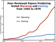 En los años 70 se realizó una estimación de las temperaturas globales superficiales, obteniendo como resultado el enfriamiento general del planeta desde 1945. De los artículos científicos considerando tendencias climáticas en el siglo XXI, solo 10 % se inclinan hacia futuro enfriamiento, mientras la mayoría predice futuro calentamiento.[2] El público general tiene poca idea sobre los efectos del dióxido de carbono sobre el clima, y Science News en mayo de 1959 preveía un 25% de incremento del CO2 atmosférico en 150 años desde 1850 a 2000, con la consecuente tendencia al calentamiento —el incremento real durante este período fue es 29%.—[3] Paul R. Ehrlich menciona cambio climático por gas de invernadero en 1968.[4] Hacia esa época la idea de un enfriamiento global llegó al público por la prensa a mediados de los 1970s, y las Tº han parado de caer, y hubo acuerdo en la comunidad climatológica acerca de los efectos de calentamiento del dióxido de carbono.[5] En respuesya a tales reportes, la Organización Meteorológica Mundial lanzó un aviso en junio de 1976 donde un muy significativo calentamiento del clima global era probable.[6]