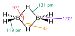 Este tipo de enlace es visto en varios compuestos de boro, como el diborano, B2H6; el monómero BH3 es inestable puesto que el átomo de boro está rodeado por solo seis electrones de valencia, y entonces, para formar un octeto estable, comparte electrones con un enlace B-H de otro monómero de borano, formando un enlace de 3 centros y 2 electrones B-H-B. En el diborano, hay dos de tales enlaces: dos átomos de hidrógeno (H) hacen puente entre dos átomos de boro (B), dejando dos átomos adicionales formando enlaces ordinarios (de dos centros y dos electrones) en cada átomo de boro.
