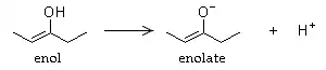 Cuando un enol pierde el Hα (el Hα es el H del Cα, y este es el que es vecino del C carbonilo), se forma el anión enolato como se muestra a continuación: